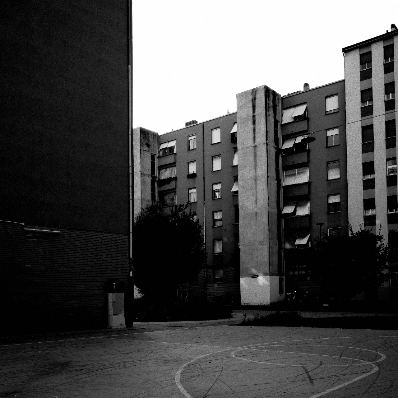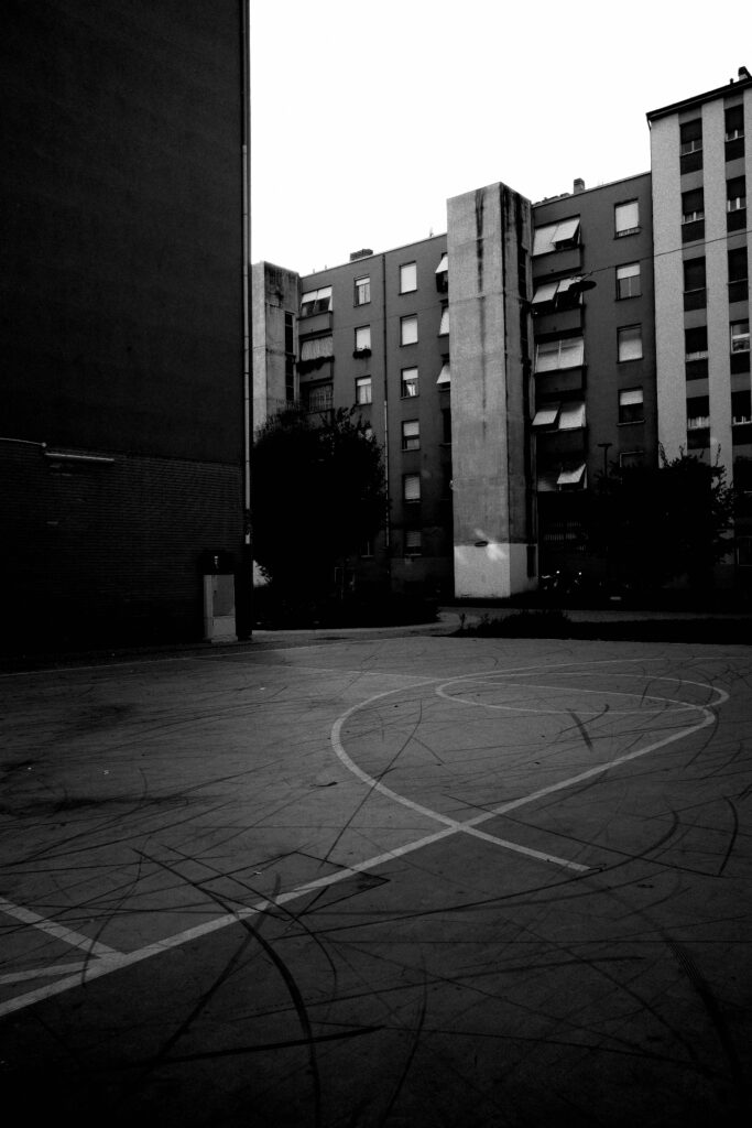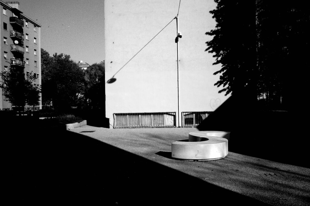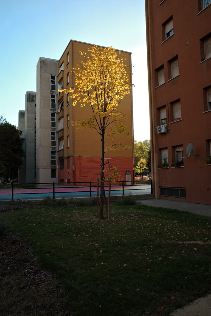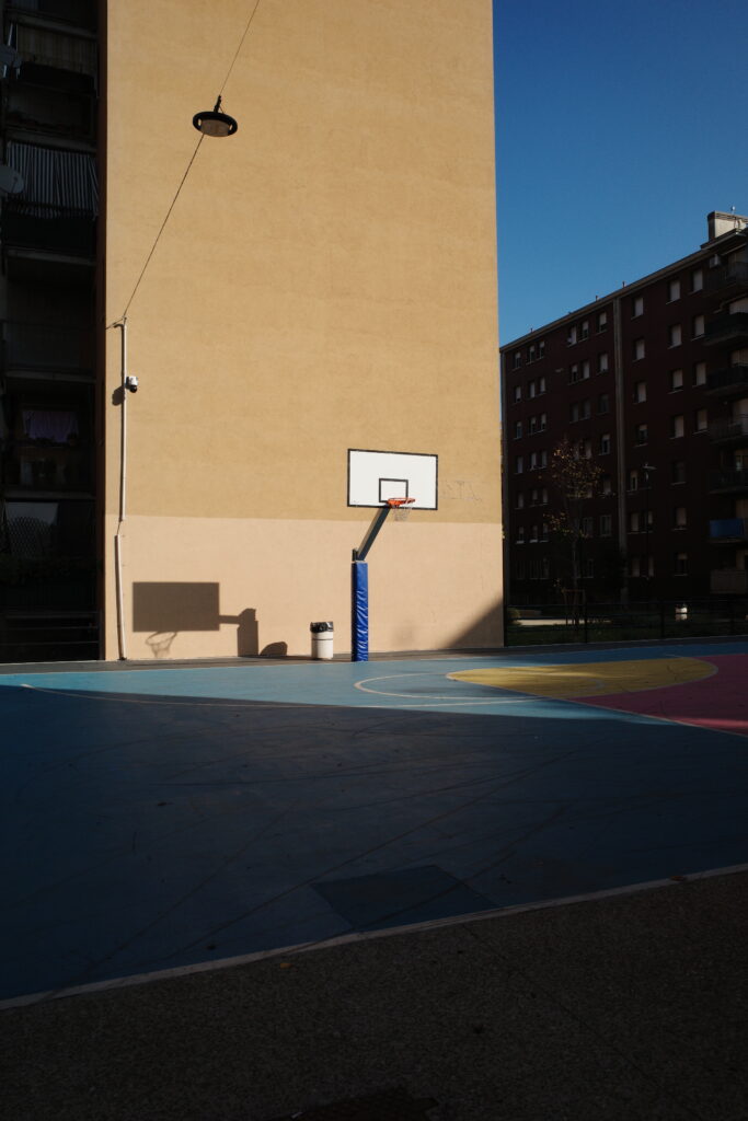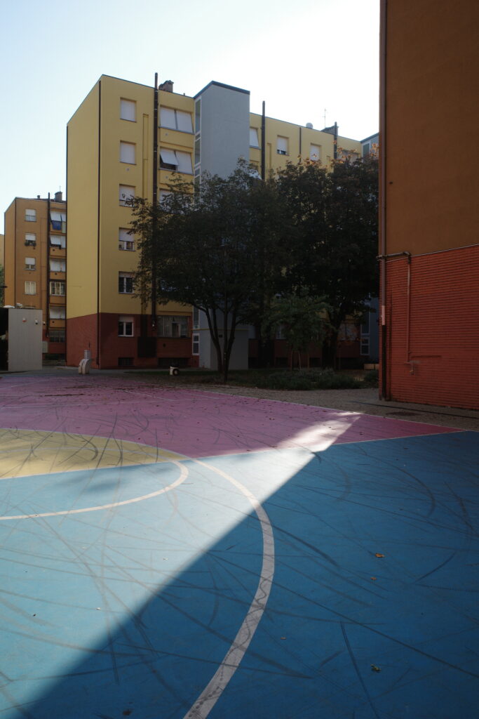 La luce abita questi spazi: penetra flebile e sottile attraverso i pilastri, si fa largo nel campo da basket e rimbalza di colore in colore, si riflette sulla superficie specchiante che ricopre la palestra di quartiere, e finisce la sua corsa su una panchina dalla forma sinuosa e moderna, a fianco di quella coppietta di pensionati che ama assaporare gli ultimi tepori dell’autunno. Sono lì fermi e in silenzio, forse stanno ripensando a quel giorno di trent’anni fa in cui si sono trasferiti qui per la prima volta o forse, semplicemente, stanno aspettando che arrivi qualcuno a cui far notare la brutta crepa sull’intonaco nuovo.
